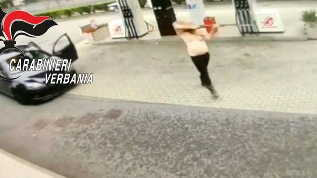 In un video ripreso dalle telecamere di sicurezza della stazione di rifornimento di Meina, si vede l'uomo a torso nudo mentre imbraccia il fucile, che si sposta minaccioso verso chi passa, per risalire poi in auto e ripartire di colpo, con la portiera ancora aperta. Viaggiava su di una vettura di grossa cilindrata, un Volkswagen, successivamente risultata rubata, così come la targa.