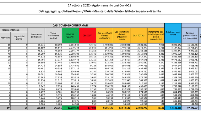 L'Italia registra 40.580 nuovi casi di Covid a fronte di 216.511 tamponi. Lo riporta il ministero della Salute nel bollettino del 14 ottobre, secondo cui i morti sono 98. I dimessi e i guariti sono 36.735. Salgono le terapie intensive (+8) e gli ingressi nei reparti ordinari (+182). Il tasso di positività si attesta al 18,7% (-0,4% rispetto a giovedì).