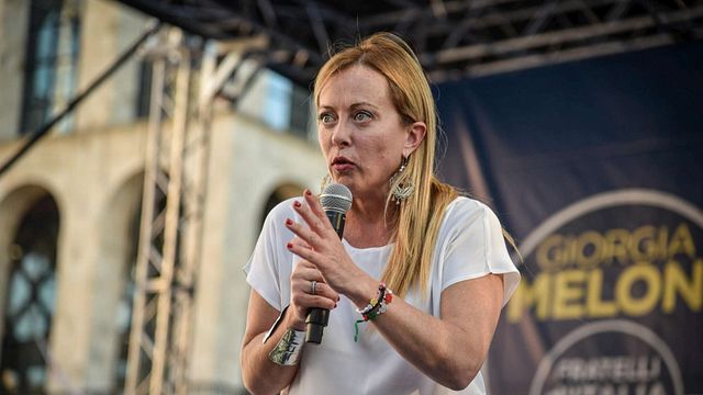 © Ansa|Giorgia Meloni festeggia il successo di Fratelli d'Italia alle politiche del 25 settembre 2022, facendo il segno della vittoria.