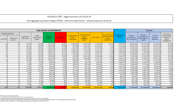 I numeri della pandemia - Il totale dei casi di Covid rilevati dall'inizio della pandemia in Italia è di 23.172.370. Gli ingressi giornalieri in terapia intensiva sono 32. I ricoverati nei reparti ordinari sono 6993. Gli attualmente positivi sono 543.207. Dimessi e guariti sono 22.450.969, mentre dall'inizio della pandemia i decessi sono stati 178.194.