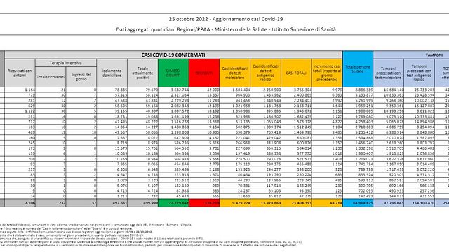 I numeri della pandemia - Il totale dei casi Covid rilevati dall'inizio della pandemia in Italia è di 23.408.393. Sono 232 i pazienti ricoverati in terapia intensiva (ieri erano 226) nel bilancio tra entrate e uscite, mentre gli ingressi giornalieri sono stati 37. I ricoverati nei reparti ordinari sono 7.106, rispetto ai 7.124 di ieri (-18). Gli attualmente positivi sono 499.999, mentre dall'inizio della pandemia i decessi sono stati 178.753.
