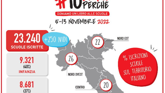 Numeri in costante crescita - Ben 23.240 le scuole che parteciperanno in tutta Italia - di cui 9.320 dell'infanzia, 8.681 delle primarie, 3.893 delle secondarie di primo grado e 1.345 delle secondarie di secondo grado -, per un numero complessivo di 189.229 classi e 3,8 milioni (per la precisione 3.770.529) di studenti. La distribuzione geografica delle adesioni ha segnato una omogeneità tra Nord, Centro e Sud e Isole dello Stivale: Nord Ovest 26%, Nord Est 22%, Centro 20%, Sud 22%, Isole 10%. Tra le regioni che spiccano per partecipazione, oltre alla Lombardia che si conferma la più attiva, si segnalano Emilia-Romagna, Piemonte, Sicilia, Puglia e Toscana. La partecipazione delle librerie è stata straordinaria con 3.275 punti vendita aderenti (rispetto alle 2.743 dell’anno scorso). Sulla piattaforma online www.ioleggoperche.it i gemellaggi attivati tra scuole iscritte e le librerie aderenti – il cuore del meccanismo che fa funzionare il progetto – sono ben 60.427 (rispetto ai 52.507 gemellaggi del 2021). Anche quest'anno sarà possibile l'acquisto da remoto (l'elenco delle librerie che rendono disponibile questo servizio è sul sito).