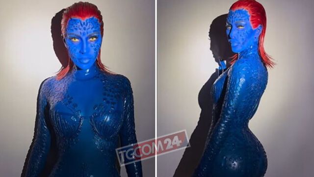 Per la festa di Halloween Kim Kardashian ha sbalordito tutti, sfoggiando un travestimento eccentrico e curatissimo nei dettagli. Sexy e spregiudicato, come l'influncer ci ha abituati da sempre. La star ha condiviso sui social scatti e video in cui posa nei panni della mutante Mystica, uno dei personaggi del franchise "X-Men", indossando un body di lattice blu attillatissimo con una finitura squamosa per evocare la protagonista immaginaria dei fumetti e dei film Marvel.