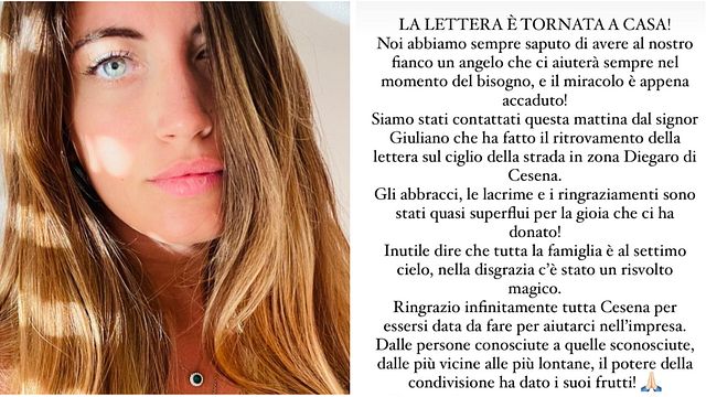 Il ritrovamento - Ad annunciare il ritrovamento della lettera è stata la stessa Molari. "La lettera è tornata a casa. Noi abbiamo sempre saputo di avere al nostro fianco un angelo che ci aiuterà sempre nel momento del bisogno, e il miracolo è appena accaduto", ha scritto la ragazza sabato mattina sui social.