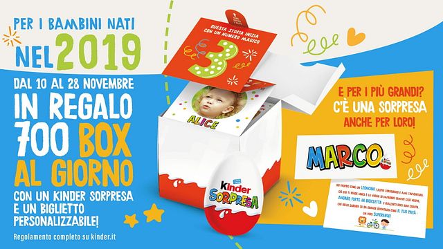 Per tutti coloro che fino al 28 novembre accederanno alla sezione dedicata su www.kinder.it, KINDER SORPRESA offrirà l’opportunità di scaricare gratuitamente una sorpresa digitale per celebrare l’unicità di ogni bambino attraverso una storia personalizzata che racconterà un viaggio speciale all’interno degli interessi e dei desideri di ciascuno di loro.