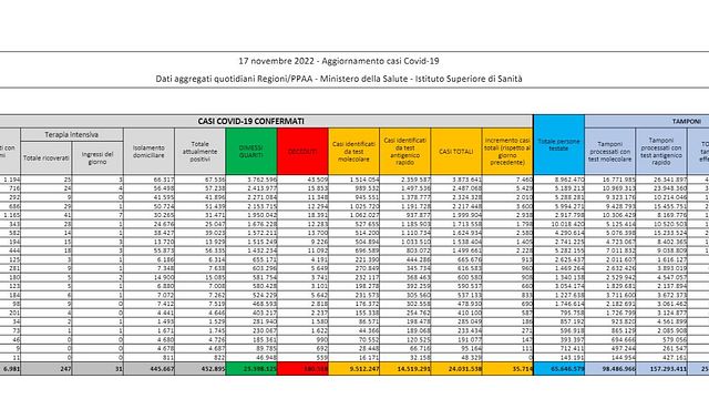 In totale, al 17 novembre, sono 247 i ricoverati nelle terapie intensive, 6.981 i ricoverati con sintomi. Sono 452.895 gli attuali positivi.