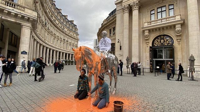 A Parigi nuovo attacco dei militanti ecologisti che hanno preso di mira la statua equestre "Horse and Rider" dello scultore americano Charles Ray. Il collettivo pro-clima Derniere Renovation ha imbrattato l'opera con una vernice arancione, rivestendola con una t-shirt dalla scritta: "858 days left" (mancano solo 858 giorni, ndr). Si tratta di un riferimento alle conclusioni di un rapporto del Gruppo intergovernativo sul cambiamento climatico secondo cui l'umanità dispone di tre anni per limitare le emissioni Co2.