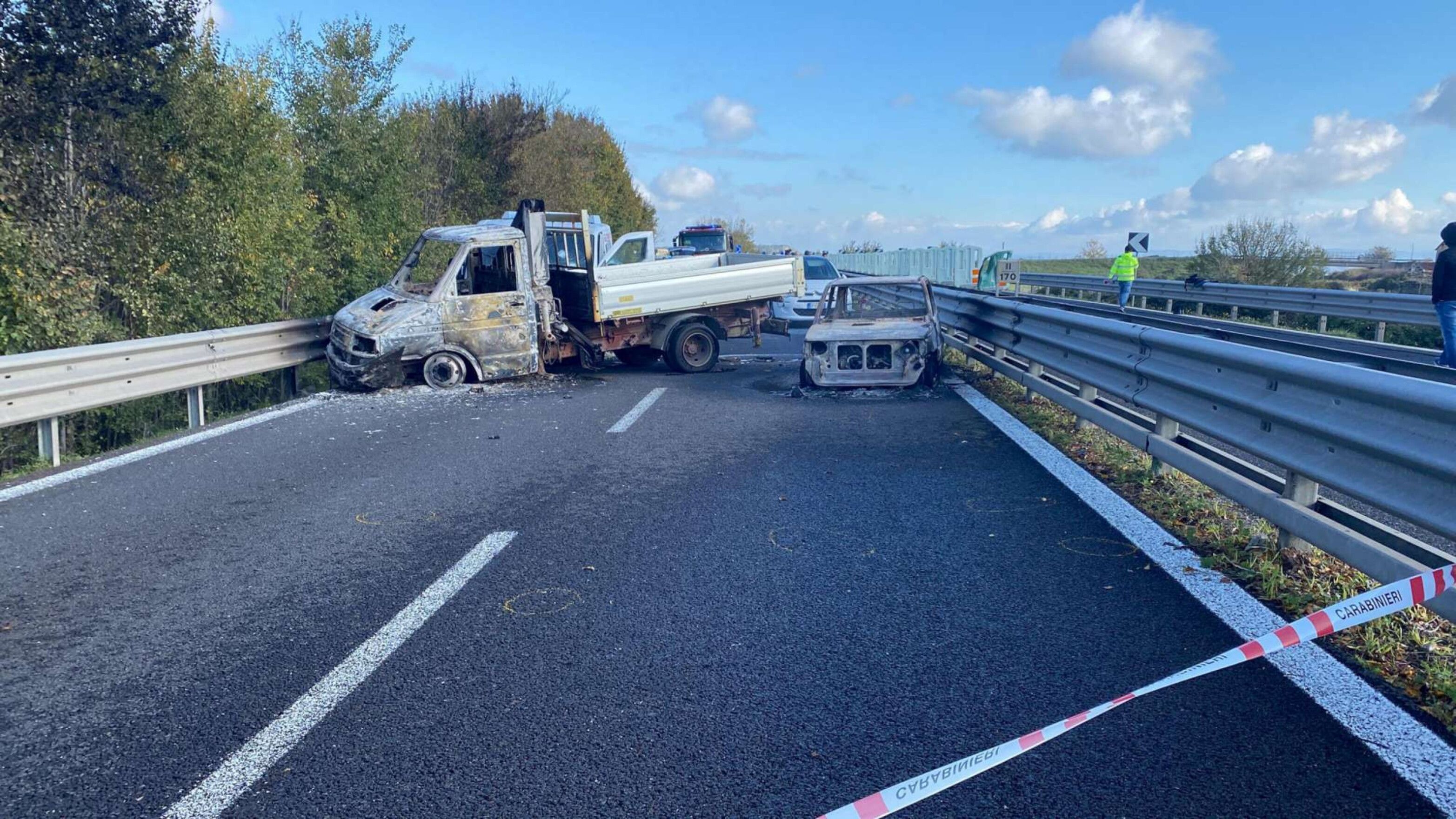 Chiodi in strada per fermare il portavalori - Per fermare il portavalori che procedeva in direzione Cagliari hanno sparso dei chiodi sull'asfalto e utilizzato un furgone e una utilitaria, dati alle fiamme, per sbarrare la strada. In direzione opposta hanno bloccato un autoarticolato minacciando l'autista con un fucile e messo di traverso il mezzo. In un video girato da un automobilista di passaggio, diventato virale sulle chat, si vede la rapina in diretta, a pochi metri dall'assalto. Si sentono chiaramente i colpi di arma da fuoco, le urla e si intravvedono le sagome di almeno tre rapinatori oltre la cortina di fumo dei mezzi incendiati.
