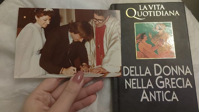 Un libro interessante lasciato fuori dal bar, nella cassetta del bookcrossing (lo scambio gratuito di libri, ndr) non sfugge all'attenzione di Angelica, 20enne milanese, che lo prende da leggere. Ma, solo a casa, si accorge del "tesoro" che quel volume contiene. Tra le pagine de "La vita quotidiana della donna nella Grecia antica", una riedizione di fine Anni Novanta, pubblicata Fabbri Editore, dell'opera della storica e scrittrice francese Claude Mossé, infatti, spunta una foto di nozze. "E' proprio il momento dell'apposizione della firma, dopo il Sì", racconta a Tgcom24 la giovane che via Facebook ha lanciato un appello per ritrovare gli sposi e restituire loro la foto. "Deve essere stata una dimenticanza, - continua, - non penso volessero disfarsene, quello scatto è unico e deve avere un valore sentimentale".