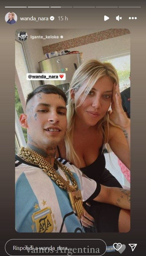 La partita insieme - Qaundo la nazionale di calcio Argentina ha battuto la Croazia durante la semifinale di Qatar 2022, Wanda Nara e L-Gante erano insieme davanti alla tv. Si sono fotografati in coppia, lui con la maglia albiceleste e vistose collane d'oro al collo e lei con un top scollatissimo che lasciava intravedere il décolleté. Un cuore a corredo dell'immagine e l'abbraccio in cui si stringono per lo scatto lascia intendere che tra loro il legame sia speciale.