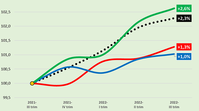 Nel post Covid non abbiamo rivali - Sebbene gli effetti economici provocati nel 2020 dalla pandemia siano stati più negativi da noi (-9 per cento del Pil) che a Berlino (-3,7 %) e a Parigi (-7,8 %), anche allargando l’arco temporale di osservazione (terzo trimestre 2020 su terzo trimestre 2022), lo score del nostro Paese è stato superiore a quello dei nostri competitori. Se in Italia il Pil è aumentato del 7,5% in Francia l’incremento è stato del 4,6 per cento e in Germania del 3,2 per cento. Nell’Area Euro-19, invece, ha toccato il 6,3%