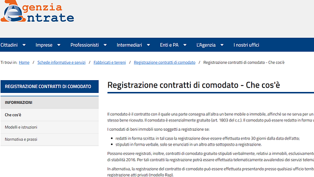 Il comodato è il contratto con il quale una parte consegna all'altra un bene mobile o immobile, affinché se ne serva per un tempo o per un uso determinato, con l'obbligo di restituire lo stesso bene ricevuto (art. 1803 del c.c.). Gli utenti e gli intermediari potranno inviare la richiesta di registrazione in via telematica attraverso la specifica procedura web che sarà attiva nell'area riservata del sito dell'Agenzia delle Entrate.