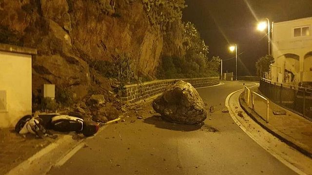 A Lacco Ameno, sull'isola di Ischia, un grosso masso del peso di alcune tonnellate si è staccato da un costone roccioso finendo in strada. È successo verso le 21 di sabato all'inizio di via Montevico, a pochi metri di distanza dal centro del comune. La caduta del masso ha danneggiato uno scooter parcheggiato. A seguito della caduta del pesante blocco di pietra e dei controlli eseguiti dai tecnici comunali è stata emessa una ordinanza di sgombero per 9 famiglie che abitano sotto il costone.
