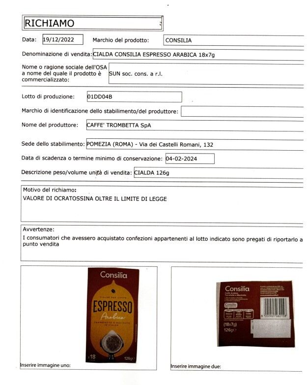 In dettaglio, si tratta delle capsule di Caffè Trombetta Arabica con lotto di produzione 02AD07B con data di scadenza 07/02/2024, delle capsule compatibili espresso Caffè Trombetta "Zio d'America" con lotto di produzione 01CD07B con scadenza 07/02/2024 e con lotto 02CD05B. Richiamate anche le cialde "Consilia Espresso Arabica" con lotto di produzione 01DD04B con scadenza 04/02/2024.