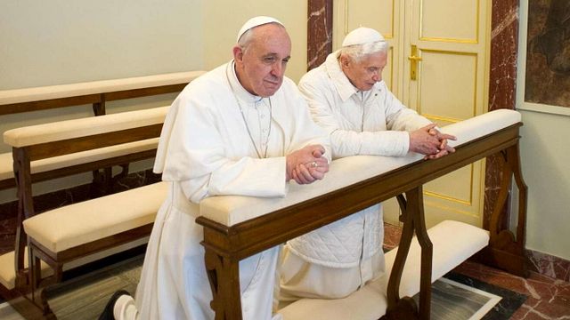 E' dalle 17 di giovedì 2 maggio 2013 che dentro le Mura vaticane, convivono due Papi, uno regnante, Francesco, e uno Emerito, Benedetto che ha scelto per il suo buen ritiro il monastero vaticano Mater Ecclesiae. Dopo la clamorosa rinuncia dell'11 febbraio 2013 e un periodo di circa quattro settimane destinato alla preparazione del conclave, Ratzinger ha formalmente rinunciato al soglio pontificio il 28 febbraio 2013, aprendo così la fase cosiddetta della "sede vacante". In quel momento lascia per un breve periodo il Vaticano, volando in elicottero a Castel Gandolfo, dove trascorre il tempo del Conclave proprio per non influenzare nemmeno solo con la sua presenza indiretta, la scelta del nuovo Papa. Ma dopo l'elezione di Francesco il 13 marzo del 2013, rientra in Vaticano per prendere possesso della sua nuova dimora, il monastero Mater ecclesiae sulla sommità del monte vaticano, vicino la riproduzione della Grotta di Lourdes, dove assumerà anche un nuovo ruolo, quello che lui stesso ha definito di Pontefice emerito, una sorta di monaco che accompagna la Chiesa con la preghiera. Da allora vive nel monastero assistito dal fido segretario, monsignor Georg Gaenswein, e dalle suore laiche, le memores domini.