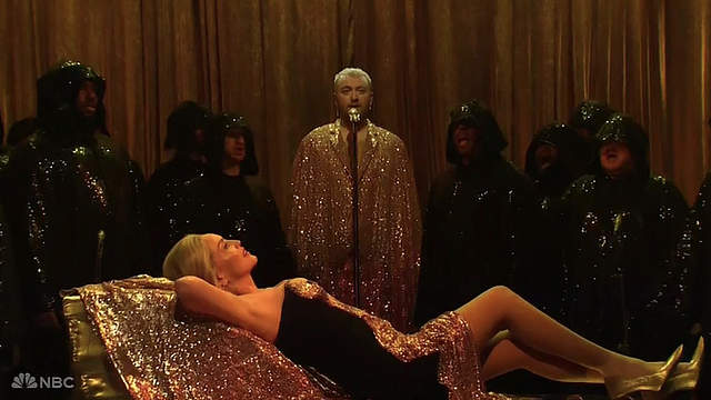 Sharon Stone, che da poco ha scoperto di avere un tumore, si è adagiata su un piedistallo ricoperto d'oro, con un braccio dietro la testa e poi si è seduta in modo seducente e ha guardato dritto nella telecamera, inscenando un remake del film del 1999 di "Gloria" diretto da Sidney Lumet. Più tardi Sharon è anche apparsa in uno sketch in bianco e nero nel ruolo della madre dell'ospite Aubrey Plaza e poi per i saluti finali con Smith, Plaza, Tony Hawk e i Property Brothers Jonathan e Drew Scott.