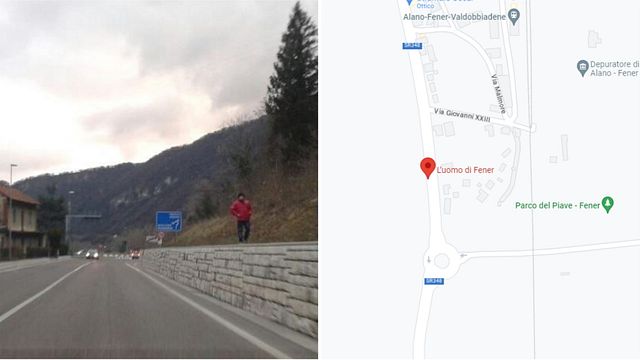 Sulla statale Feltrina, nel territorio di Alano di Piave (Belluno), un uomo si posiziona da trent'anni su un muretto di pietre e osserva e saluta gli automobilisti. Ora quello che i residenti della zona chiamano "l'uomo di Fener" (il nome di una frazione di Alano di Piave) e che è divenuto un punto di riferimento per chi percorre la strada tutti i giorni è diventato un "monumento" su Google Maps. Nell'app, infatti, appare un contrassegno con il suo nome "d'arte" nel punto in cui si colloca tutti i giorni.