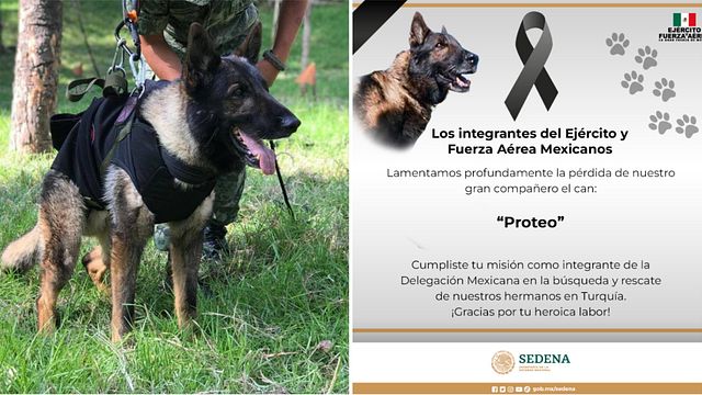 "I membri dell'esercito e dell'aeronautica messicana sono profondamente addolorati per la perdita del nostro grande compagno, il cane Proteo. Hai compiuto la tua missione come membro della delegazione messicana nella ricerca e nel salvataggio dei nostri fratelli in Turchia. Grazie per il tuo lavoro eroico", questo il messaggio diffuso sui social dal Segretariato per la Difesa Nazionale messicano.