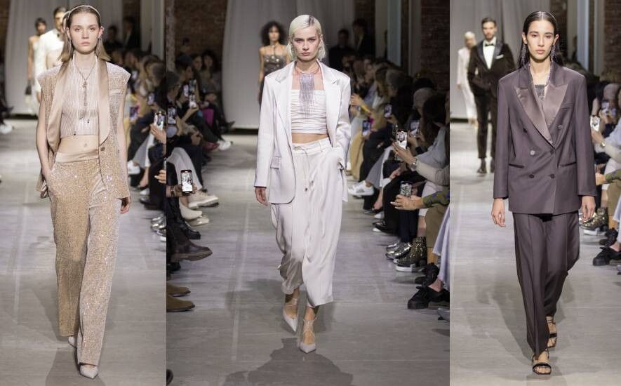La collezione Peserico dà così vita a capi iconici con blazer dall’attitudine maschile accostati a leggerezze femminili e set-up tricot dalle texture ricercate. Fluide sete laminate per maxi gonne-pantalone e slip dress sofisticati. Maxi pull in angora con luminose cascate d’argento e di cristalli. Completi in velluto e abiti in leggerissime reti illuminati di scintillanti paillette con effetti opalescenti.