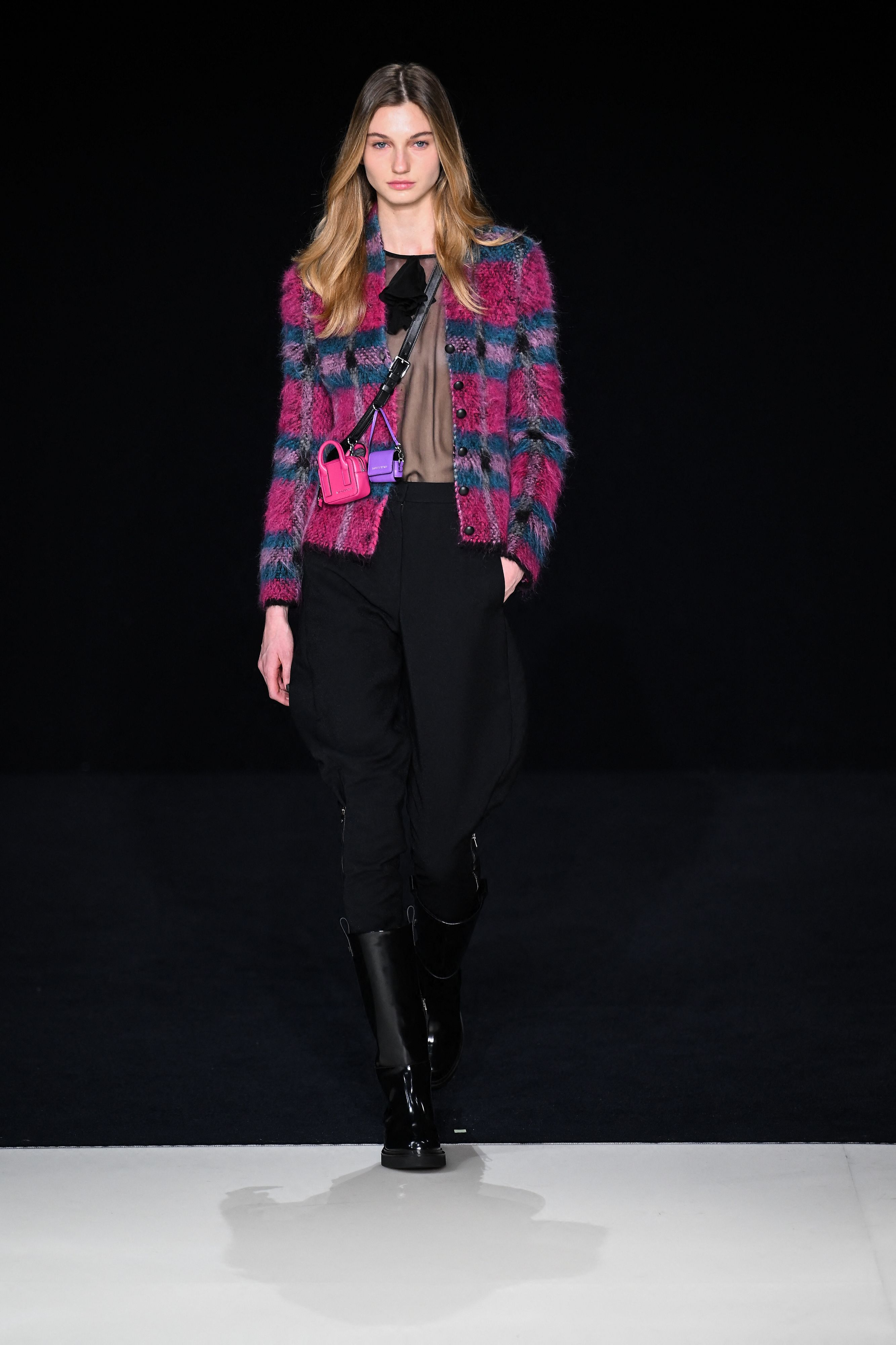 I piccoli cappelli, così come le giacche dalle abbottonature asimmetriche e i top da sera con le bretelle di gros, ricordano l’abito di scena. La collezione è svelta, leggera: orli corti abbinati a stivali, alternati a pantaloni fluidi. La silhouette è precisa, scattante, con le spalle segnate e la vita marcata da alte cinture a bustino. Il gioco di maschile e femminile è lampante come un tratto di Dna, declinato in giochi di volumi e texture, con le superfici lucide mescolate ai mohair, ai canvas, ai velluti operati, in un amalgama di neri, bianchi e grigi con tocchi di magenta intenso e luminescenze metalliche. Il giorno e la sera si scambiano, negli abiti come negli accessori: bomber di velluto intagliato, grandi shopper ricoperte di paillettes, un colletto di camicia che fa da collana sull’abito da sera. Nel cerchio, come a teatro, tutto torna, nel segno di un classicismo fuori registro.