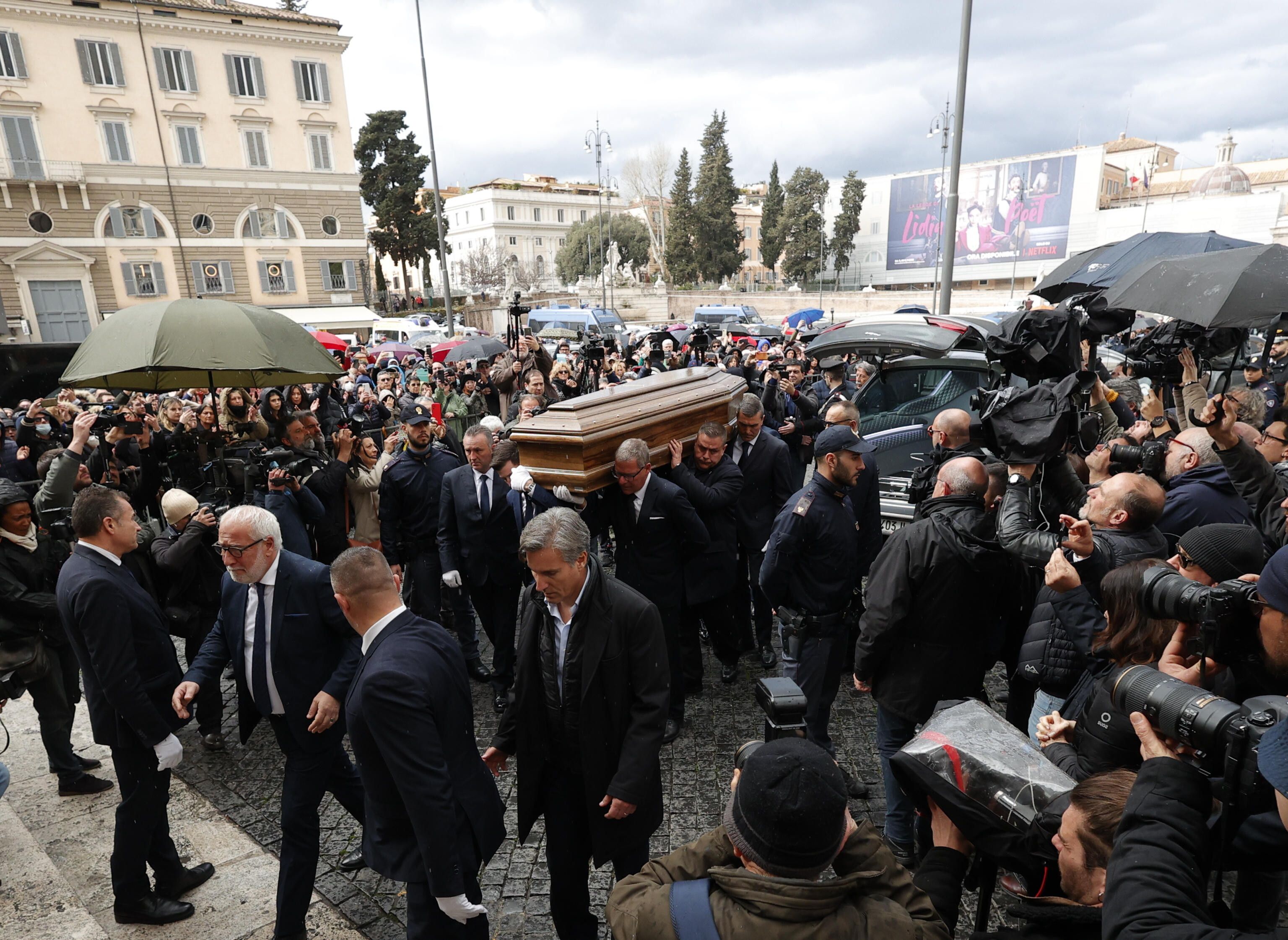 Da Paolo Sorrentino a Gerry Scotti, Emanuele Filiberto di Savoia, Fiorella Mannoia, Valerio Scanu, Massimo Lopez a Tullio Solenghi, Pio e Amedeo e Aurelio De Laurentits. Tanti i personaggi del mondo dello spettacolo entrati per tempo nella chiesa per la celebrazione. Maria De Filippi, accompagnata per mano dal figlio Gabriele, ha fatto il suo ingresso seguendo di pochi minuti l'arrivo del feretro. Con lei in auto, c'era Raffaella Mennoia, autrice di 'Uomini e Donne'. Pochi minuti dopo è stata la volta di Pier Silvio Berlusconi.