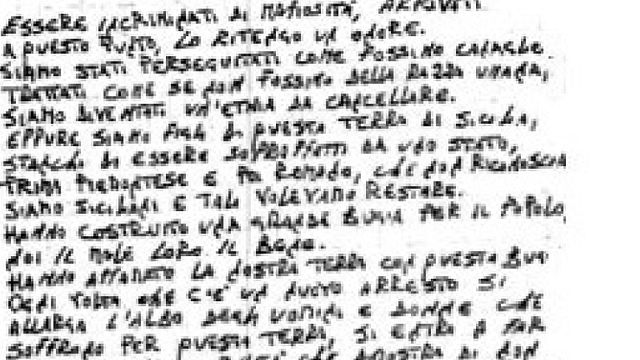 "Hanno costruito una grande bugia per il popolo. Noi il male, loro il bene. Hanno affossato la nostra terra con questa bugia - proseguiva il testo scritto dall'ex capo di Cosa Nostra -. Ogni volta che c'è un nuovo arresto si allarga l'albo degli uomini e delle donne che soffrono per questa terra. Si entra a far parte di una comunità che dimostra di non lasciare passare l'insulto, l'infamia, l'oppressione, la violenza. Questo siamo e un giorno sono convinto che tutto ci sarà riconosciuto e la storia ci restituirà quel che ci ha tolto la vita".