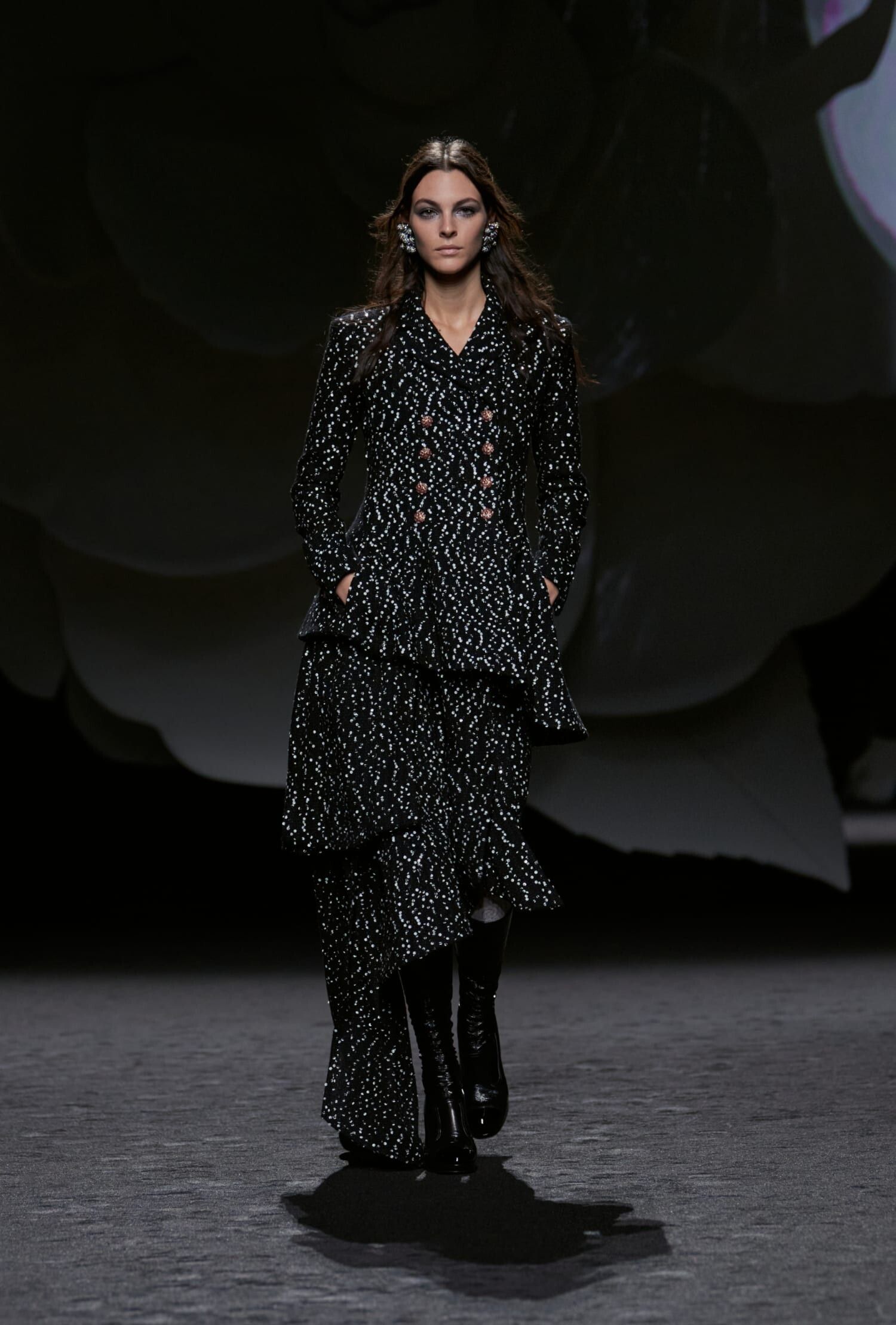 La camelia di Chanel, tanto cara a Mademoiselle Coco, dà piccoli tocchi gioiosi: sboccia su tasche, giacche, bottoni e nel romanticismo sospeso delle stampe. L'asimmetria dei cappotti, gli spacchi degli abiti, il davanti inclinato dei completi bermuda, le balze, le schiene scoperte, le perline e le paillettes, i fili fantasia della maglieria, raccontano una collezione delicata e in movimento, che dà forma al ritratto di una donna artista.