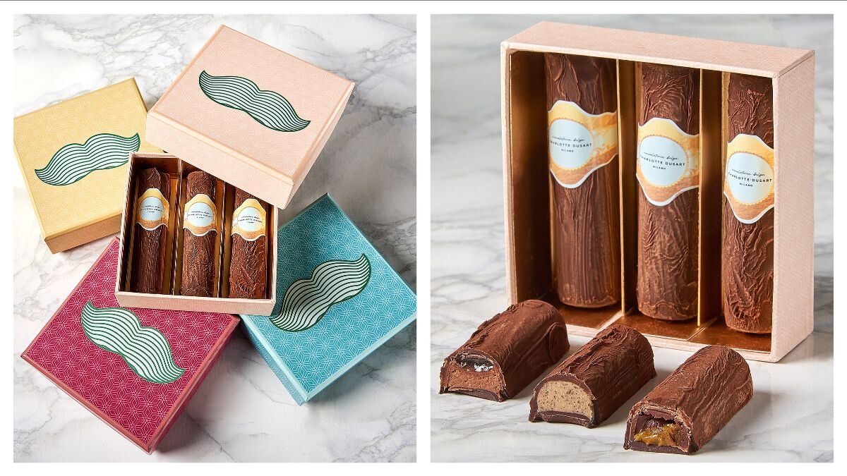 Per i papà con barba e baffi, ma anche per quelli senza, in ogni caso incapaci di resistere alla tentazione del cioccolato, una scatola dalla grafica in puro stile Charlotte Dusart, colorata e stilosa contenente tre sigari con tre gusti diversi: cremino e caffè, rum e uvetta e pralinato e nocciola con lime (proposta vegana).