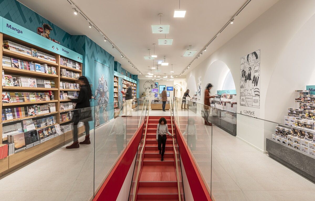 L’ideale percorso immersivo esperienziale prosegue verso il primo piano dove il visitatore trova ad accoglierlo grandi statue iconiche a dimensione naturale raffiguranti personaggi del mondo dei supereroi e dei manga: ci si sta avventurando in Just Comics, il format ideato da Mondadori Retail dedicato agli appassionati di fumetti. L’area pop e colorata è una vera esplosione di stili, forme, storie, tratti, un caleidoscopio di avventure ed emozioni, ben sintetizzate dall’installazione che parte dalla parete di fondo, si espande a soffitto, e rischiara l’area stessa: a invadere lo spazio, a uscire dalla griglia, frammenti di comics retroilluminati.