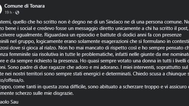 "Scusatemi, quello che ho scritto non è degno né di un sindaco né di una persona comune. Non utilizzo bene i social e credevo fosse un messaggio diretto unicamente a chi ha scritto il post, da non scrivere ugualmente", si è precipitato a scusarsi Sau a polemica scoppiata. "Non ho mai mancato di rispetto e ho sempre pensato che la presenza femminile sia risolutiva in tutte le problematiche, infatti nelle giunte da me nominate ho sempre e da sempre richiesto la presenza. Chiedo scusa a chiunque si sia sentito/offesa/o. Ho quasi sempre votato una donna in tutti i livelli di elezioni. Sono padre di due ragazze che adoro e mi adorano - ha concluso -. I miei interventi, soprattutto sul calo nascite nei nostri territori sono sempre stati energici e determinati. Purtroppo, come tanti in questa zona difficile, sono abituato a scherzare troppo e vi assicuro che solitamente scherzo sulle mie disgrazie".