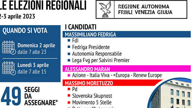 Il Friuli Venezia Giulia è chiamato al voto per l'elezione del presidente della Regione e per il rinnovo del Consiglio regionale. Seggi aperti dalle 7 alle 23 di Domenica 2 aprile e dalle 7 alle 15 di lunedì 3 aprile. Nelle stesse giornate si svolgeranno anche le elezioni in 24 Comuni della Regione, tra cui quelli più popolosi di Udine e Sacile. Quest'ultimi, avendo più di 15mila abitanti, potrebbero essere chiamati alle urne anche per l'eventuale turno di ballottaggio (domenica 16 aprile, dalle 7 alle 23, e lunedì 17 aprile, dalle 7 alle 15).