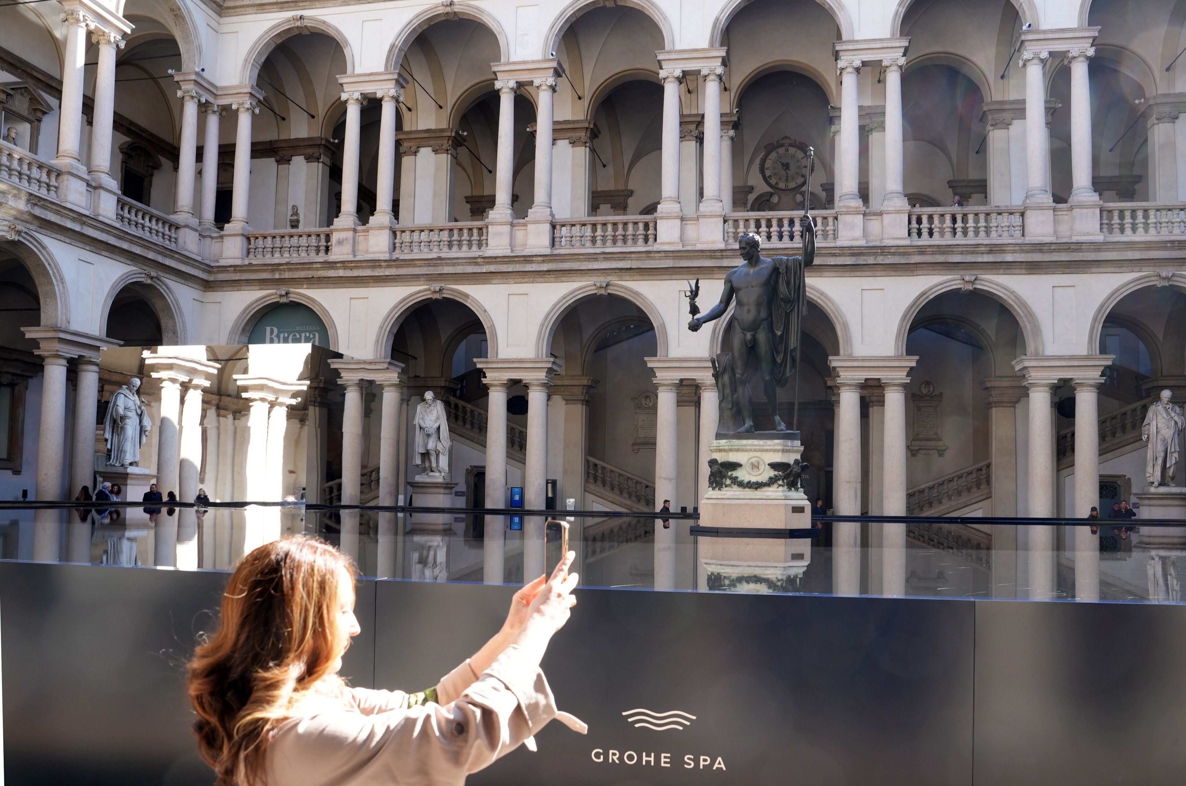 Un gioco di riflessi che riflette e moltiplica i porticati e la statua di Napoleone, grazie a un gigantesco pavimento d'acqua: così si presenta il cortile d'onore del Palazzo di Brera. Per il Fuorisalone di Milano l'edificio che ospita l'Accademia e la Pinacoteca si è infatti trasformato grazie all'installazione "Health Through Water" realizzata da Grohe, azienda leader mondiale nelle soluzioni di design per il bagno.