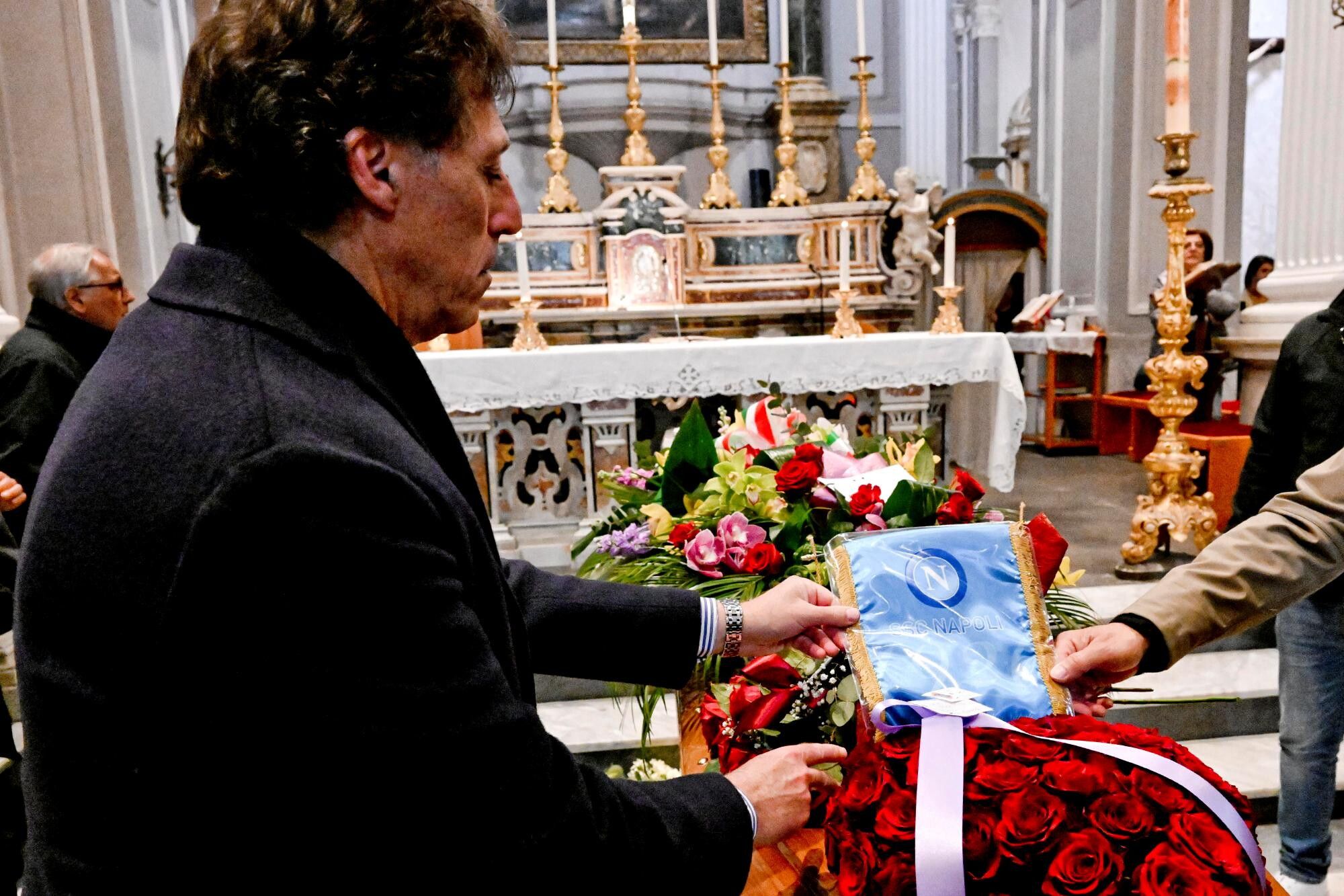Stretti nel dolore in prima fila i familiari, tantissimi cittadini e fan, gente comune raccolta sul sagrato della chiesa e nella piazza. Tra gli artisti presenti, Andrea Sannino, Angelo Di Gennaro, Peppe Iodice, Alan De Luca, Biagio Izzo, Lucia Cassini, Simone Schettino, attori di Made in Sud, Enrico Durazzo. L'ultimo saluto in piazza San Ciro vicino alla fontana allestita come un enorme Vesuvio di bianco e celeste. I colori del Calcio Napoli, la squadra di cui era gran tifoso