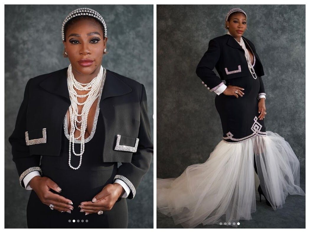 Serena Wiliams ha mostrato il suo pancione in un sorprendente vestito nero che stringeva le sue curve esaltandole. Strass sui polsi, sui bordi dei taschini e intorno alla prorompente scollatura facevano da pendant con la coroncina tra i capelli. Al collo una collana di perle avvolta a più giri e a fine abito una coda di tulle bianco vaporoso. Elegante anche il marito con un sobrio smoking nero accompagnato da un papillon.