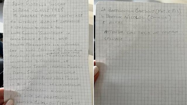Queste invece, le righe vergate a mano dalla 97enne: "Sono Fiorella Ingrao di Roma - classe 1925. Mi farebbe piacere contattare via internet qualche compagna o compagno di scuola del Liceo Ginnasio Giulio Cesare in Corso Trieste a Roma dove abbiamo frequentato sia il ginnasio che il liceo (sezione B) fino alla maturità. Ricordo qualche nome come: Ninetta Ansaldi, la capoclasse Di Cristofaro, la bravissima Todaro, i fratelli Occorsio, I fratelli Simonetti, Vittorio Lumia, Giovanni Cesareo Bracco, Nora Pagano, la bella Pescatori, la sua compagna di banco Cianfarani e così via. E che dire dei professori: il dantista Martinelli (Italiano), il Proff Marani (Latino e Greco), la professoressa Bardone (matematica e fisica) il professor Nicolosi (chimica) e altri… Attendo con ansia un vostro segnale".