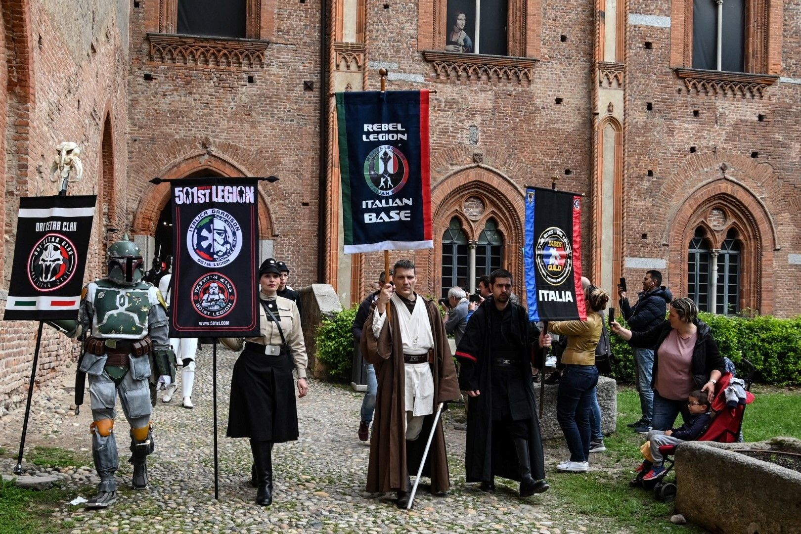 Alle ore 15.00 da Piazza della Vittoria parte la solenne parata di tutti i personaggi in costume, che sfila lungo le vie del centro di Pavia, fino ad approdare in piazza del Duomo, al suono di due suonatori di tromba (Alessio Molinaro e Giorgio Tosatti) che guidano il corteo e fanno strada suonando i temi più celebri della colonna sonora, il main title theme dei titoli di testa e l’iconica Marcia Imperiale composti dal Premio Oscar John Williams. Un’occasione unica per trascorrere un’intera giornata in compagnia dei propri eroi preferiti e ammirare da vicino manufatti e costumi che sono le fedeli riproduzioni dei costumi di scena e degli oggetti usati nei film.