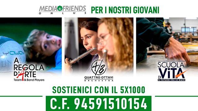 Devolvendo il proprio 5X1000 a Mediafriends –codice fiscale 94591510154– quest'anno sarà possibile contribuire ai progetti “Scuola di vita”, “A Regola d’Arte” e “orchestra Quattro Ottavi”, tre iniziative dedicate ai ragazzi: