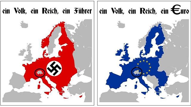 Da "un Popolo, un Reich, un Fuhrer" a "un Popolo, un Reich, un Euro". La retorica anti-nazista della propaganda russa aggiunge un altro esempio alla campagna social a sostegno della guerra in Ucraina: una vignetta in cui il Terzo Reich di Hitler viene (ancora una volta) paragonato all'Europa contemporanea. D'altronde lo ha ricordato anche lo stesso Vladimir Putin durante il "Giorno della Vittoria" nella Seconda Guerra Mondiale, che in Russia si celebra il 9 maggio: "In Occidente si stanno distruggendo i memoriali, si sta creando un culto del nazismo. Anche questo oltraggio è un crimine, il revanscismo di chi stava preparando una nuova campagna contro la Russia". L'immagine è stata pubblicata su un canale filorusso su Telegram che fa riferimento a Sergei Markov, ex consigliere del presidente russo.