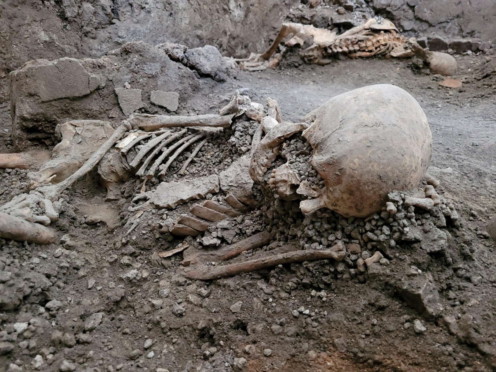 A Pompei non fu soltanto l'eruzione a causare la morte degli abitanti ma anche un terremoto. Gli scavi hanno restituito gli scheletri di due nuove vittime nell'Insula dei Casti Amanti. Lo rende noto il ministero della Cultura. Sono le vittime del sisma che accompagnò l'eruzione del 79 d.C., ritrovate sotto il crollo di un muro avvenuto tra la fase finale di sedimentazione dei lapilli.