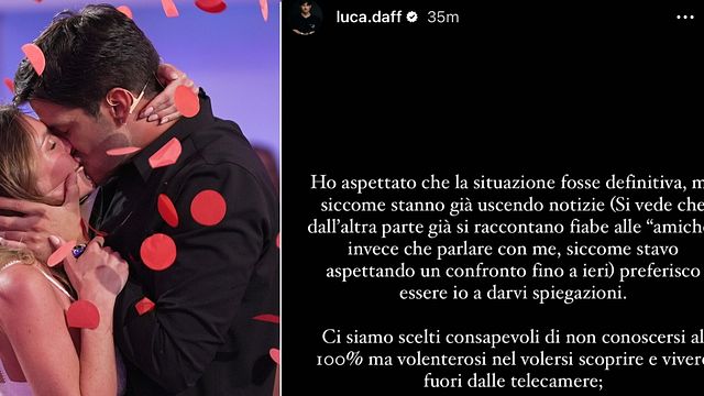 Il messaggio di Luca - "Ho aspettato che la situazione fosse definitiva - ha scritto Daffré su Instagram -, ma siccome stanno già uscendo notizie (Si vede che dall'altra parte già si raccontano fiabe alle "amiche" invece che parlare con me, siccome stavo aspettando un confronto fino a ieri) preferisco essere io a darvi spiegazioni". L'ex tronista ha poi proseguito: "Ci siamo scelti consapevoli di non conoscersi al 100% ma volenterosi nel volersi scoprire e vivere fuori dalle telecamere - si legge nel lungo post -, ho provato a portarla nel mio mondo ma con costanti incomprensioni che non ci hanno permesso di viverla serenamente, non è andata come speravamo, nella vita di tutti i giorni ci siamo accorti di essere il sole e la luna". Tuttavia, Daffré rivendica la sua sincerità nella scelta di Alessandra: "Conscio di essere sempre stato me stesso, sincero dal primo momento, la mia scelta nel programma è stata voluta e sentita, ma purtroppo le cose non sempre vanno come speriamo".
