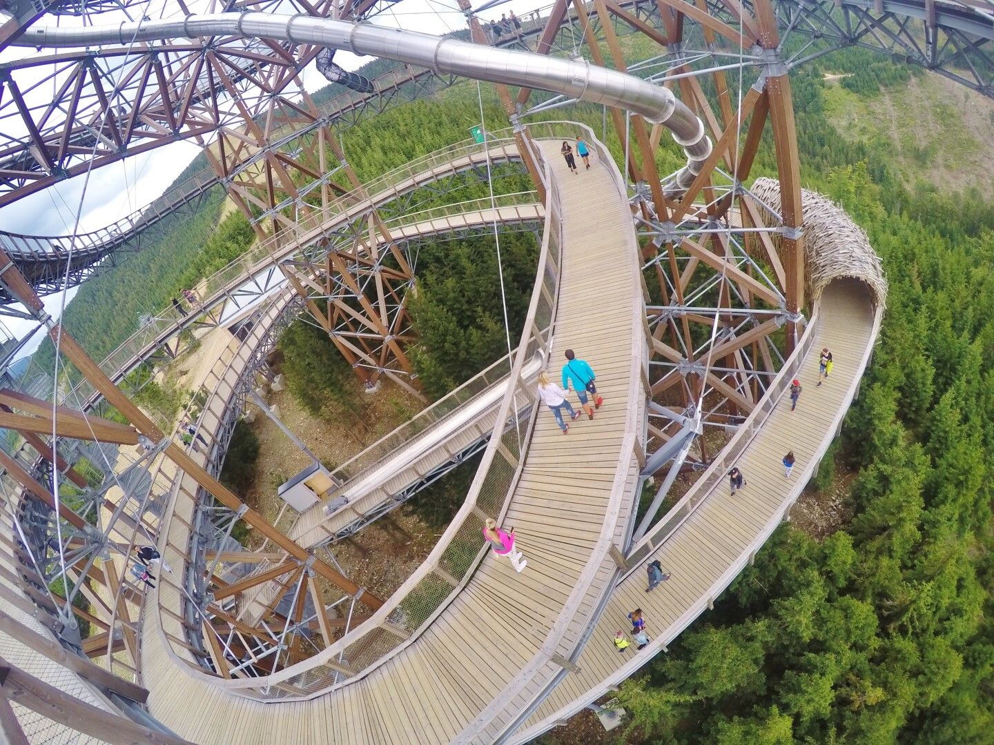 Oltre le chiome degli alberi - Nei videogiochi dei vostri figli ci sono mostri che si proiettano fuori dalla terra e incombono minacciosi sui poveri umani? Sostituiteli con una torre di sovrumana bellezza e lanciate la sfida di conquistarne, passo dopo passo, curva dopo curva, la vetta, fino a lasciare il mondo (e le chiome degli alberi) ai propri piedi. Tutto questo è possibile a Janske Lazne, nei Monti dei Giganti. La magnifica e mastodontica spirale panoramica in legno, non è che l’estremo slancio verso il cielo (a 45 metri da terra) di un già “vertiginoso” percorso sospeso tra le fronde degli alberi (a 23 metri dal suolo). Anche qui, per i leoni coraggiosi –non quelli codardi da tastiera- c’è uno scivolo adrenalinico per scendere a tutta velocità dalla torre.