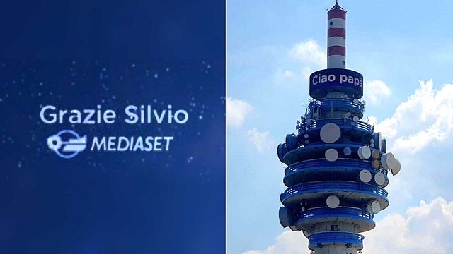 Sulla Torre Mediaset, la grande struttura con i ripetitori che si innalza sugli studi televisivi di Cologno Monzese, si alternano da stamattina due scritte: 'Ciao Papa'' e "Grazie Silvio". Le scritte hanno sostituito momentaneamente il logo Mediaset e sono visibili anche dalle tangenziali.