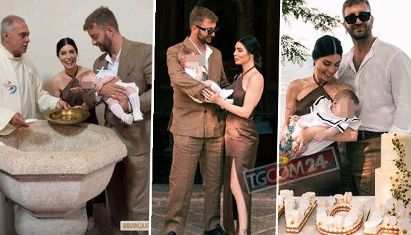 Bianca Atzei e Stefano Corti hanno scelto un look coordinato per il battesimo di Noa: lei in abito lungo marrone con spalle scoperte e ampia scollatura sulla schiena, lui il completo dello stesso colore. Erano emozionatissimi mentre stringevano tra le braccia il loro piccolino e dai loro occhi e sorrisi traspariva tutta la gioia del momento. Per festeggiare hanno voluto una cream tarte e una torta a due piani molto eleganti, come bomboniera hanno scelto una scultura decisamente particolare che rappresenta una mamma, un papà e il loro bambino.
