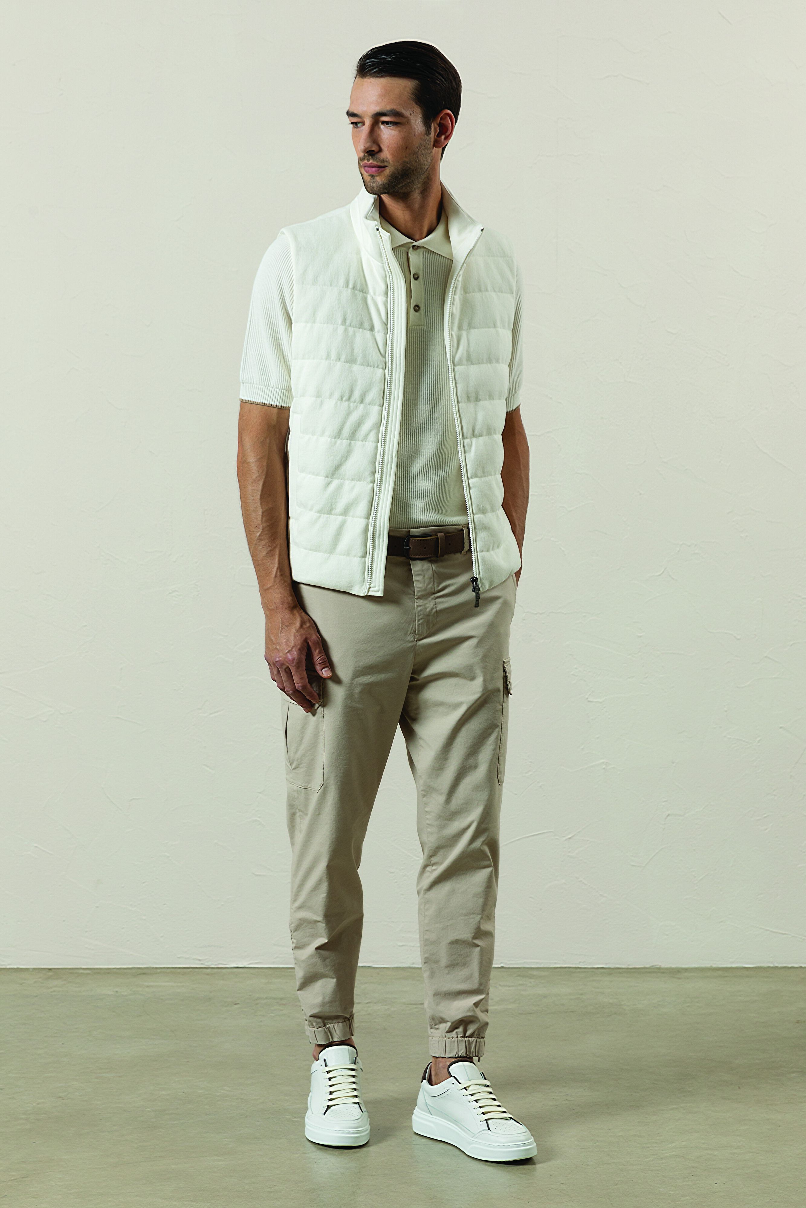 È una collezione che si divide in due atti. Nel primo, Rive salmastre, tessuti performanti assumono i colori della laguna, associandosi ad autenticità e materiali organici. Le stoffe, accoppiate, uniscono il lino, la lana e la seta a lavorazioni impermeabili e antivento, tingendosi dei toni calmi e profondi del verde che richiamano le barene e la laguna. I toni naturali della juta e del seppia si traducono in tessuti tecnici dalla mano tridimensionale, donando unicità a capi da vivere in esterno.