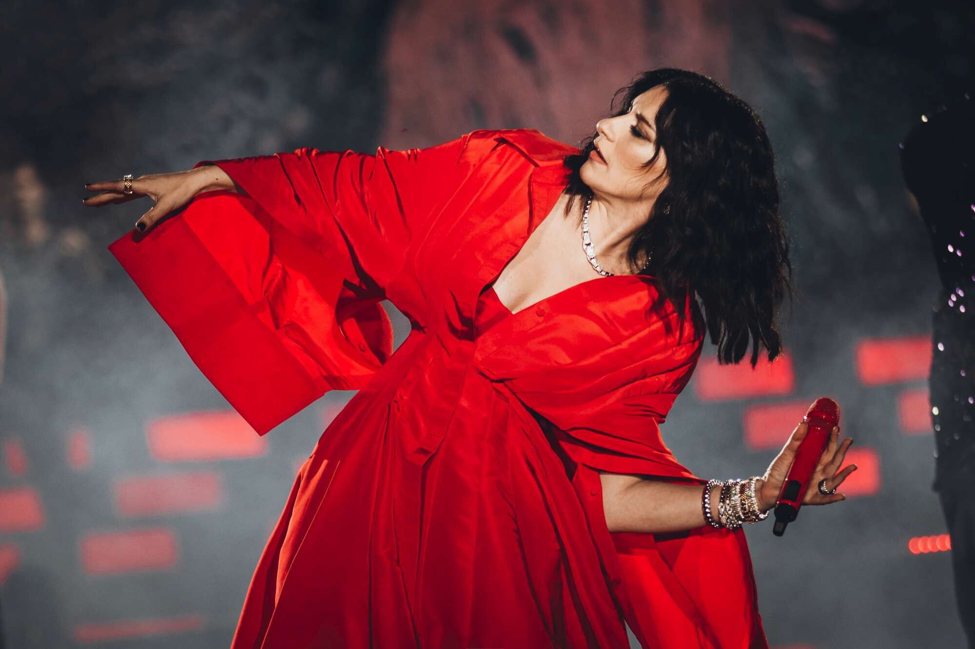 L’apertura del secondo atto ha un riferimento ai cambiamenti climatici, alla terra che si trova “in stato di crisi perché ogni giorno noi sbagliamo” e la dedica, sul megaschermo è chiara: “Questo concerto è per la mia Romagna”. E visto che questo secondo blocco è dedicato al presente, e vede arrangiamenti più contemporanei, lo start è dato da “Un buon inizio”, il penultimo singolo uscito. Su queste note iniziano a scendere le prime gocce su una piazza San Marco che si colora di k-way antipioggia. Ma tempo di sentire “Frasi a metà” e “Io canto” che ci si ritrova nel bel mezzo di un nubifragio, con folate di vento, l’acqua che sale e un impianto che a un certo punto salta. Laura, cambiato il microfono bagnato e non più funzionante, prova a cantare da sotto un tendone allestito sul palco (“anche se non mi piace perché vorrei prendere l’acqua come voi”, dice): ed è costretta a farlo, per 20 minuti buoni, a cappella, improvvisando, perché l’impianto e molti strumenti sono ko. Ko però non ci finisce mai la voce di Laura e nemmeno il suo pubblico, che resta fradicio al suo posto a cantare e a seguire un concerto a questo punto già diventato epico per resistenza e condizioni avverse: “Ho fatto più di mille concerti ma durante quelli storici, come San Siro e Taormina, ha sempre piovuto. Oddio così tanto mai a dire il vero”, dice Laura mentre cerca di capire dal suo staff se può proseguire o meno, tra la necessità di salvaguardare l’impianto, led che saltano, audio in tilt e cuffie che non rispondono (“Nelle orecchie sento rumori talmente gracchianti che mi sembra di essere a un concerto di Marylin Manson”, scherza Laura). Appena la pioggia non è che finisce ma almeno diminuisce di intensità la scaletta riparte, senza la scenografia e i balletti previsti, con “Come se non fosse stato mai amore”, “Resta in ascolto” e “Primavera in anticipo”.