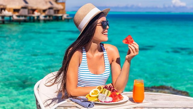 UN GELATO AL POSTO DEL PRANZO (O NIENTE DEL TUTTO) - Complice la pigrizia del mezzogiorno e il desiderio di non lasciare la battigia, durante le vacanze si tende a saltare il pranzo o a sostituirlo con un gelato. Non è una buona idea e, soprattutto, non serve a dimagrire. Ci troveremo a combattere tutto il giorno con il buco nello stomaco e a cena mangeremo molto del dovuto. Molto meglio organizzarsi per pranzo con una bella insalata, che mescoli verdura e frutta (mango, papaya, melone bianco) e anche un po’ di frutta secca o semi oleosi. Prediligere, in generale, cibi ricchi di vitamine, sali minerali e anti-ossidanti, che svolgono un ruolo importante nel contrastare l’azione dei radicali liberi prodotti dai raggi UV e ricordiamoci di bere acqua abbondantemente. Evitiamo però di arricchire troppo la nostra insalatona, ad esempio con formaggi e salumi. Se poi aggiungiamo ingredienti come tonno, uova sode e salse, ricordiamo che non stiamo più consumando uno spuntino leggero, ma un vero e proprio pasto, molto ricco di calorie.