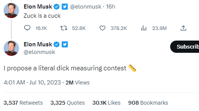 Il tweet di Musk è apparso sotto a un post in cui si mostra uno scambio di battute fra Zuckerberg e l'account di Wendy's. Il fast food americano gli suggeriva di andare nello spazio per far arrabbiare il fondatore della società aerospaziale SpaceX. Consiglio che il Ceo di Meta ha commentato con una faccina che ride. La proposta non è stata apprezzata da Musk, che ha definito il rivale "a cuck". Questa parola descrive la pratica in cui un uomo prova piacere nel guardare la propria partner avere rapporti sessuali con altre persone. Lo stesso termine indica anche chi è debole o privo di dignità e personalità. La replica del patron di Tesla non è finita qui. In un secondo tweet, pubblicato alcune ore dopo, ha proposto un concorso per stabilire chi dei due abbia il pene più lungo.