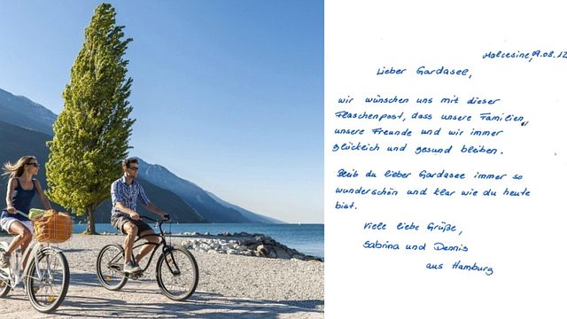 Il messaggio è scritto a mano e firmato da Sabrina e Dennis, presumibilmente una coppia di Amburgo che era stata in vacanza sul Lago di Garda e si era trovata bene al punto da consegnare alle acque un testo beneaugurante per le loro vite e per il futuro dello stesso lago. "Purtroppo", spiegano dal Comune di Malcesine, "nell'aprire la bottiglia, quest'ultima si è rotta. Ma il biglietto lo custodiamo gelosamente". L'amministrazione comunale ha lanciato un appello per ritrovare Sabrina e Dennis in modo da poter "per regalare loro un'esperienza da ricordare".