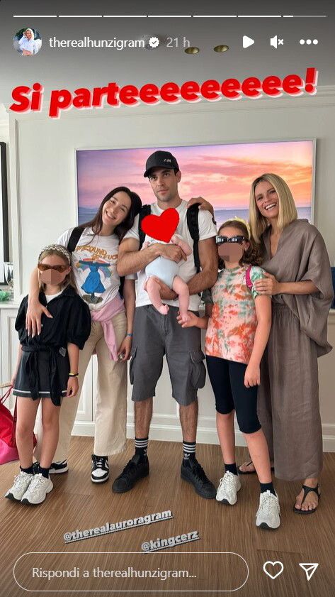 Michelle Hunziker e Aurora Ramazzotti sono pronte a godersi una bella vacanza in Sardegna. Prima della partenza postano uno scatto social di gruppo con il piccolo Cesare (al suo primo volo in aereo), Goffredo Cerza e Sole e Celeste Trussardi. A trascorrere qualche giorno con loro nella villa vista mare affittata per l'occasione c'è anche Tommaso Zorzi, amico di vecchia data e ormai uno di famiglia.