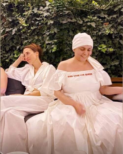 Una festa con tutti vestiti in bianco e rilassati nel giardino di casa quella per le nozze queer di Michela Murgia. Una serata che sa di felicità, ma che nelle sue intenzioni è stata un manifesto politico sulla famiglia che si sceglie, una sfilata di moda dove la sposa sfoggiava la scritta "God save the queer" ricamata con perline rosse sull'abito e dove, al posto della testa della regina, c'era il suo volto. Nella nuova casa romana che può contenere tutta la famiglia della scrittrice c'erano i quattro figli e il resto della queer family: Lorenzo, Claudia, Marco, Alessandro, Cinzia, oltre alle scrittrici Chiara Valerio e Chiara Tagliaferri, il cantante lirico Francesco Leone, Roberto Saviano, Nicola Lagioia, Paolo Repetti, Teresa Ciabatti.